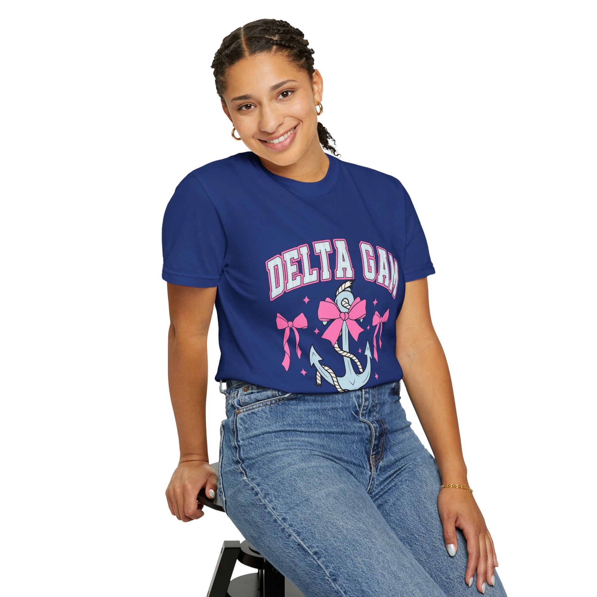 This DeeG Unisex Garment-Dyed T-shirt features a cute anchor design, perfect for sorority apparel or as a gift for sisters. The nautical style tee gives off a coastal and preppy vibe, fitting seamlessly into a casual wardrobe. Ideal for those who love all things nautical and are part of a sorority. Perfect for birthdays, holidays, or as a thoughtful gesture.