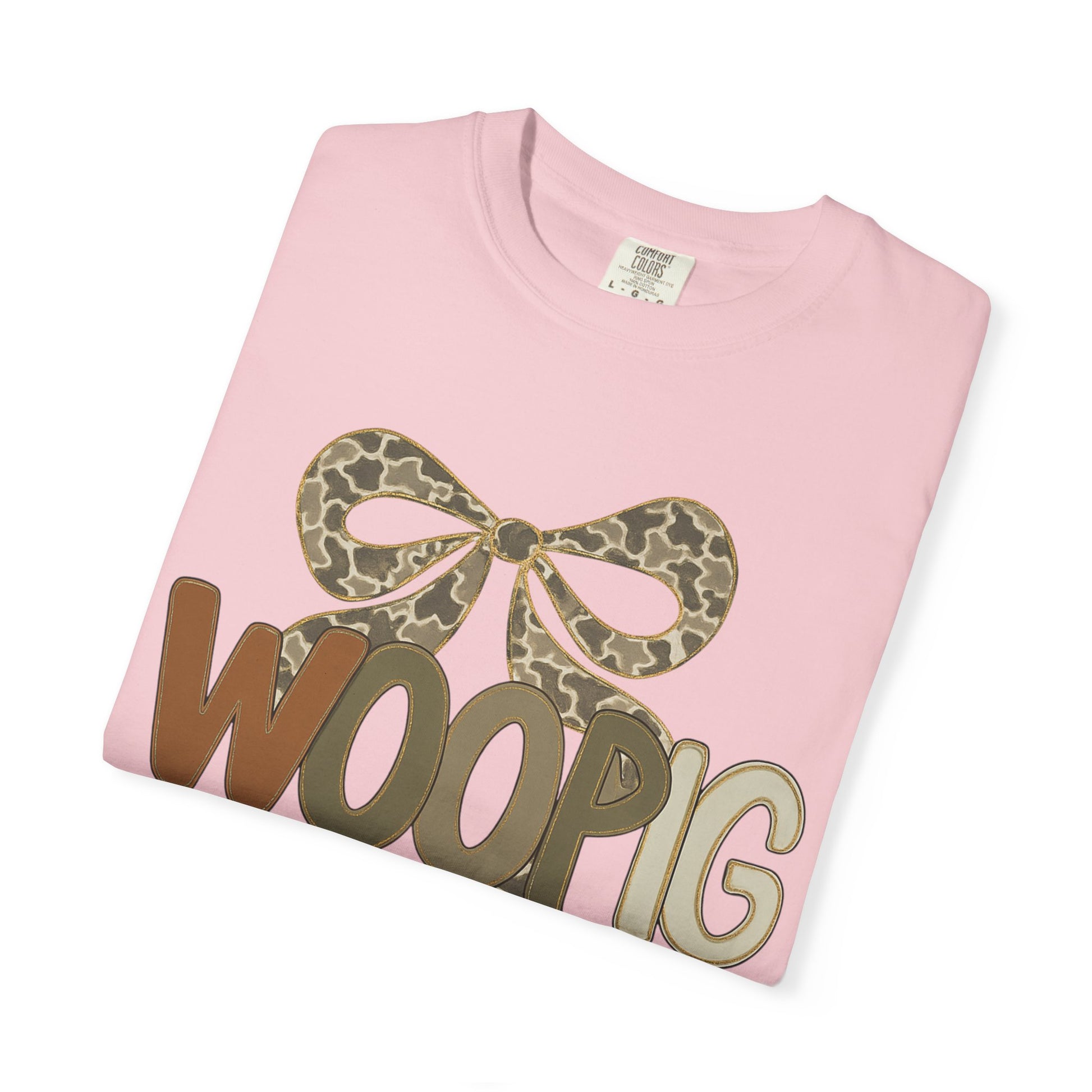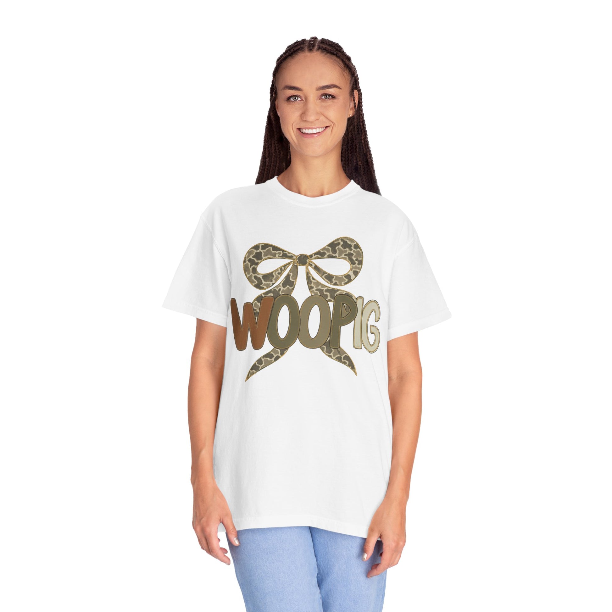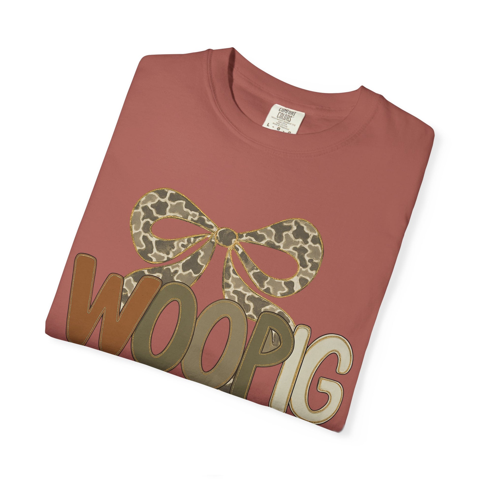 This relaxed, garment-dyed tee brings a playful, outdoorsy spirit to everyday wear. The front-center design pairs a stylized bow in muted leopard print with bold, friendly letters that read “WOOPIG” in earthy brown and olive tones. It feels lived-in from the first wear—soft, slightly textured color from the garment-dye process and a relaxed fit that drapes comfortably. Wear it on weekend runs to the farmer’s market, casual nights around a fire pit, or while running errands when you want something easy, quirky, and familiar. The single-piece tubular knit keeps the silhouette clean, while the sturdy double-needle stitching means this shirt will be part of your rotation for seasons. Subtle, charming, and a little bit cheeky—this tee slides seamlessly into a wardrobe that values relaxed comfort and personality.