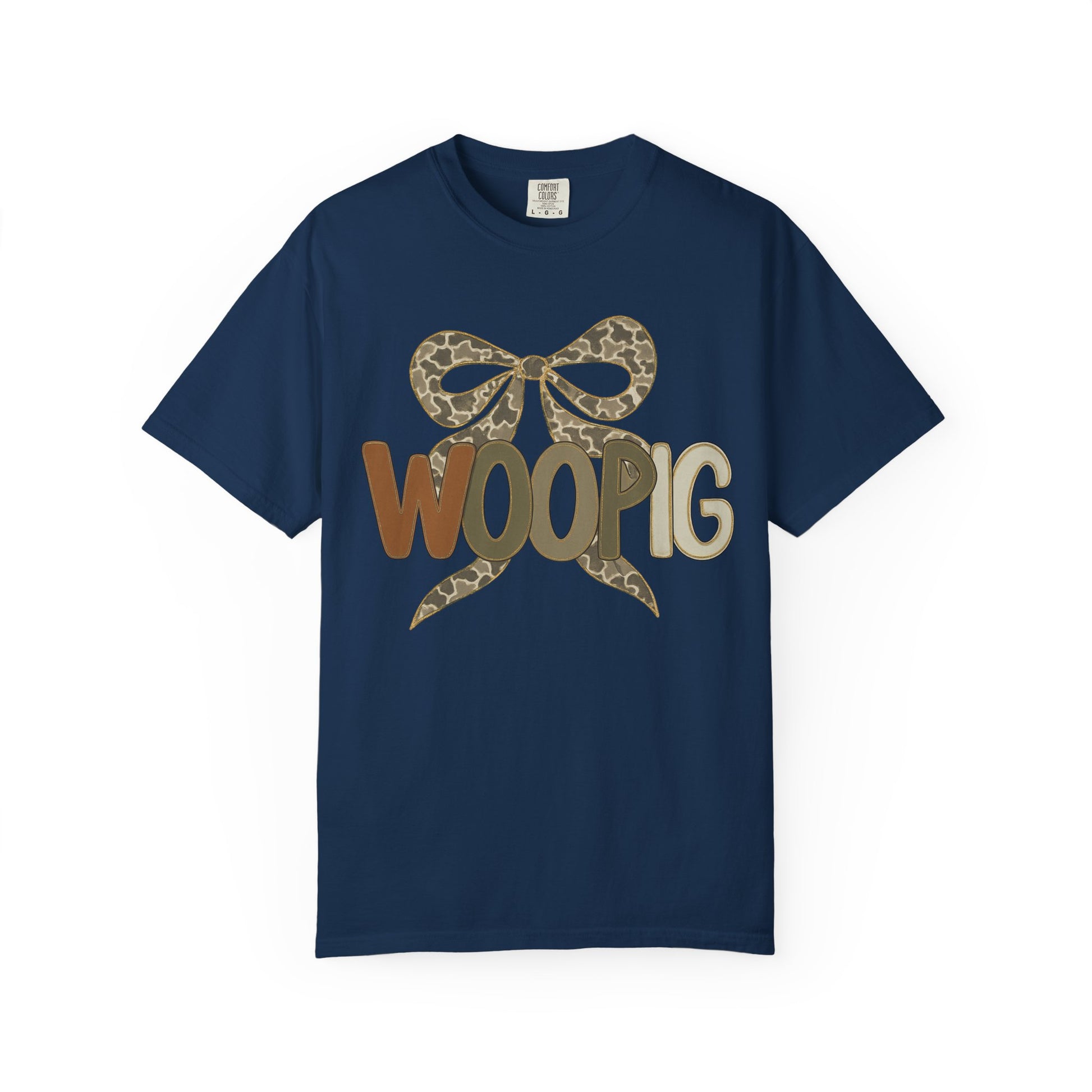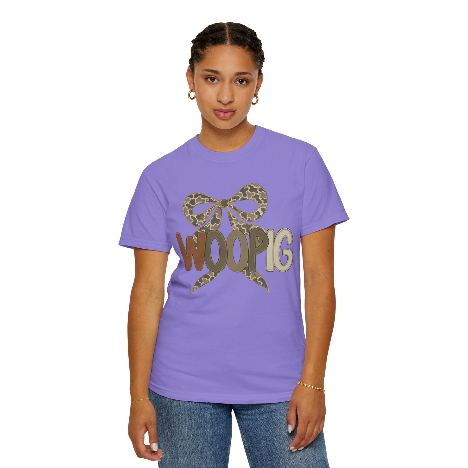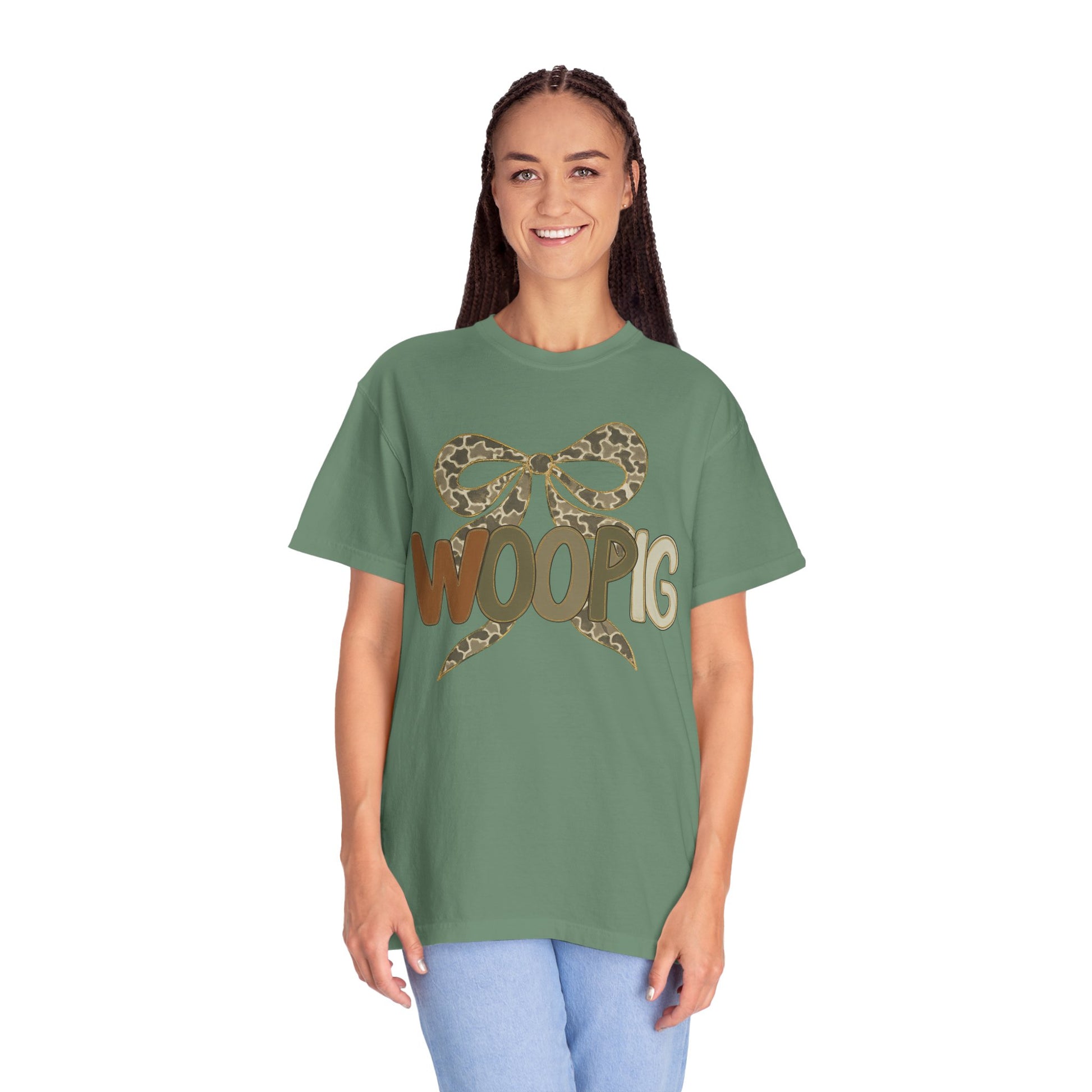 This relaxed, garment-dyed tee brings a playful, outdoorsy spirit to everyday wear. The front-center design pairs a stylized bow in muted leopard print with bold, friendly letters that read “WOOPIG” in earthy brown and olive tones. It feels lived-in from the first wear—soft, slightly textured color from the garment-dye process and a relaxed fit that drapes comfortably. Wear it on weekend runs to the farmer’s market, casual nights around a fire pit, or while running errands when you want something easy, quirky, and familiar. The single-piece tubular knit keeps the silhouette clean, while the sturdy double-needle stitching means this shirt will be part of your rotation for seasons. Subtle, charming, and a little bit cheeky—this tee slides seamlessly into a wardrobe that values relaxed comfort and personality.