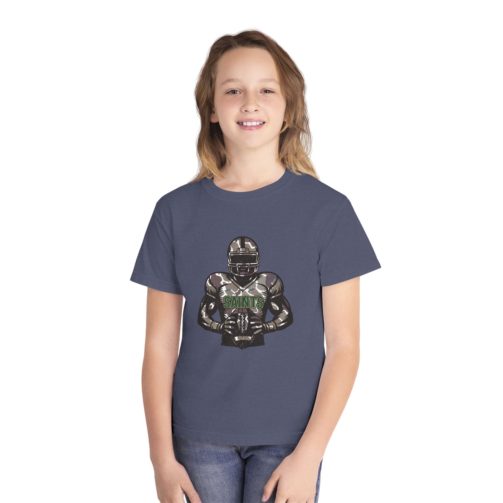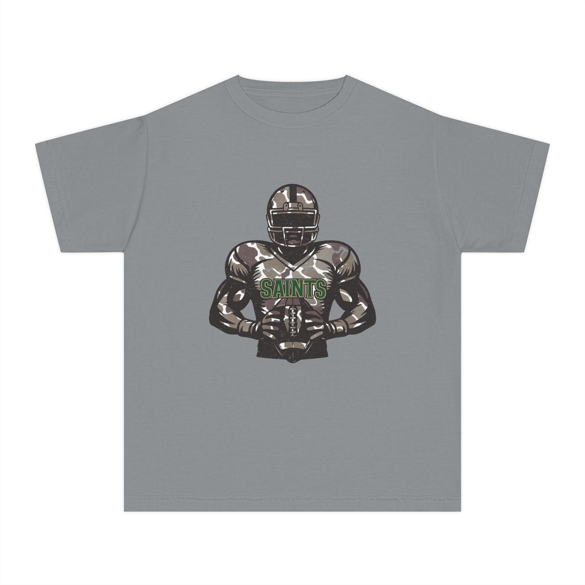 Youth Camouflage Football Tee, perfect for young fans looking for casual sportswear. This versatile everyday fashion piece is ideal for game day apparel and makes a great gift. The tee gives off a sporty vibe and is relevant for sports events and game days.